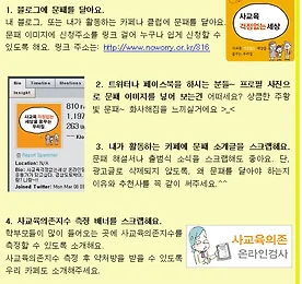 사교육걱정없는세상 문패 썸네일형 리스트형 [필독] 문패달기, 1만 가정 이렇게 만나요!! 문패-블로그.jpg 문패-트윗터페이스북.png 1. 게시물을 클릭해서 들어간다 2. 오른쪽 아래, 댓글쓰기 위에 있는 [스크랩]을 눌러서 퍼가고 싶은 카페를 선택한다. 3. 스크랩해간 추천의 이유를 밝히며 회원들에게 적극적으로 알린다. ^^ ............... 참 간단하죠?? 1. 이미지 파일을 올린다. 2. 이미지 파일을 '드래그'하고(마우스로 한번 슥~긁어주시면 파란색부분에 설정을 할 수 있게 됩니다.) 링크 (ctrl+k) 걸기를 열어 연결하고 싶은 주소를 넣는다. 3. 확인을 누르고 글을 게시한후 링크가 잘 걸렸는지 다시한번 확인해본다. 더보기 이전 1 다음
