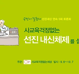 1/26(화) : 직업/대학/진로설계 토론 종합 후 대안을 모색하다 -6회 연속 토론회 중 최종 토론회... 직업, 대학, 진로 대책 5회에 걸친 토론회를 최종 정리하고 대안을 모색하는 토론회 -남미자,김성천(본 단체 연구소)의 발제에, 홍종학 교수(경원대), 김대호 소장(사회디자인연구소)의 발제와 이종태 박사(한국청소년정책연구원 전 원장) 논찬 나서... -5회에 걸친 토론회 전체를 마무리하면서, 사교육걱정없는세상이 이와 관련 해야 할 정책, 실천 과제를 모색할 예정... 미래직업, 대학, 진로설계 6회 연속 토론회 최종 토론회가 2010년 1월 26일(화) 사교육걱정없는세상에서 개최됩니다. 이번 토론회는 지난 5회에 걸친 ‘직업/노동/대학/진로교육’토론회를 최종 정리하며, 그에 따라서 사교육걱정없는세..